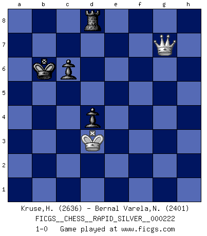 Last move : 1-0 2019 May 10 20:38:12 [Event "FICGS__CHESS__RAPID_SILVER__000222"] [Site "FICGS"] [Date "2018.10.07"] [Round "1"] [White "Kruse,Herbert"] [Black "Bernal Varela,Nelson"] [Result "1-0"] [WhiteElo "2636"] [BlackElo "2401"] 1.Nf3 e6 2.d4 f5 3.g3 Nf6 4.Bg2 Be7 5.O-O Ne4 6.c4 O-O 7.Qc2 d5 8.Rd1 Nd7 9.Be3 c6 10.Ne5 Bf6 11.Nd3 a5 12.Nd2 Nxd2 13.Rxd2 Qe7 14.b3 g5 15.f4 Qg7 16.Qc3 h6 17.a4 Kh7 18.Kh1 Be7 19.Rb2 g4 20.c5 h5 21.Bf2 Rh8 22.e3 Kg8 23.Bf1 Nf6 24.Bg2 Nd7 25.Qe1 Rh7 26.Kg1 Bd8 27.b4 axb4 28.Qxb4 Ba5 29.Qb3 Qh6 30.R1a2 Bd8 31.Bf1 Nf6 32.Be1 Qf8 33.a5 Qe8 34.Ne5 Bc7 35.Bd3 Ra7 36.Qd1 Rg7 37.Qe2 Rh7 38.Qf1 Kg7 39.h4 gxh3 40.Qxh3 Ng4 41.Qh1 Bd7 42.Be2 Kg8 43.Bxg4 fxg4 44.Rf2 Qd8 45.Qh2 Be8 46.f5 Qg5 47.fxe6 Re7 48.Rf4 Rxe6 49.Raf2 Bxa5 50.Bxa5 Rxa5 51.Nxg4 Kg7 52.Ne5 Ra3 53.R2f3 Rxe5 54.dxe5 Qxe5 55.Qd2 Bg6 56.Qd4 Qxd4 57.exd4 Ra1+ 58.Rf1 Ra4 59.g4 h4 60.g5 Be4 61.Rxh4 Rxd4 62.Rf6 Rc4 63.Re6 Rc2 64.Re5 Kf7 65.Kf1 Ra2 66.Rf4+ Kg6 67.Rf6+ Kh5 68.Rh6+ Kg4 69.g6 Kf3 70.Rh3+ Kf4 71.g7 Bg2+ 72.Ke1 Bxh3 73.g8Q Kxe5 74.Qh8+ Ke4 75.Qxh3 Ra1+ 76.Kd2 Ra2+ 77.Kc1 Kd4 78.Qb3 Rg2 79.Qb4+ Kd3 80.Qb3+ Kd4 81.Qxb7 Kxc5 82.Qa7+ Kd6 83.Qa3+ Kc7 84.Qe7+ Kb6 85.Qd8+ Kb7 86.Kd1 Ra2 87.Qe7+ Kc8 88.Qd6 Kb7 89.Qf4 Kc8 90.Qg4+ Kb7 91.Qf3 Ra5 92.Qf4 Ra2 93.Qe3 Rb2 94.Kc1 Rg2 95.Qf3 Rg7 96.Qe2 Rf7 97.Qe5 Rf2 98.Qg7+ Kc8 99.Qg4+ Kb7 100.Kb1 Rf7 101.Kc2 Kc7 102.Qg3+ Kd7 103.Qh3+ Kc7 104.Qe3 Rd7 105.Kd3 d4 106.Qe8 Rd8 107.Qe5+ Kb6 108.Qg7 Rd6 109.Qg3 Rd8 110.Qg7 1-0 Reti Opening Kingside Castling by player White (move 5) Kingside Castling by player Black (move 6) 10 pieces endgame at move 72 : White KRPP , Black KRBPPP WHITE : King + 1 Rook 2 Pawns BLACK : King + 1 Rook 1 Bishop 3 Pawns Promotion Queen by player White (move 73) 9 pieces endgame at move 73 : White KQP , Black KRBPPP WHITE : King + 1 Queen 1 Pawn BLACK : King + 1 Rook 1 Bishop 3 Pawns 8 pieces endgame at move 75 : White KQP , Black KRPPP WHITE : King + 1 Queen 1 Pawn BLACK : King + 1 Rook 3 Pawns 7 pieces endgame at move 81 : White KQP , Black KRPP WHITE : King + 1 Queen 1 Pawn BLACK : King + 1 Rook 2 Pawns 6 pieces endgame at move 81 : White KQ , Black KRPP WHITE : King + 1 Queen BLACK : King + 1 Rook 2 Pawns Player White won this chess game. Follow this game move after move (download)Weak points or holes in the opponent's position must be occupied by pieces not Pawns. (Siegbert Tarrasch) Ich habe Putins Aufstieg an die Macht beobachtet und seine Politik, die demokratischen Institutionen meines Landes zu zerstören. (Garry Kasparov) Los finales de Peón son del Ajedrez lo que el cesped es del Golf. (Cecil Purdy) Ne tendez aucun piège pour le plaisir ! Ne jouez rien dans l'espoir que l'adversaire réagisse de façon stupide ! Prenez toujours pour acquis que l'adversaire va trouver le meilleur coup ! Ne jouez jamais de coup dans l'espoir que l'adversaire ne voie pas la menace ! Chacun de vos coups doit améliorer la position d'une façon ou d'une autre. You must have a dream in order to have it come true. (A.P.J. Kalam)