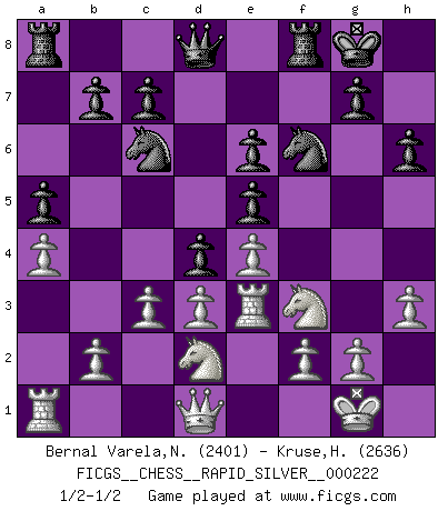 Last move : 1/2-1/2 2018 October 17 11:59:43 [Event "FICGS__CHESS__RAPID_SILVER__000222"] [Site "FICGS"] [Date "2018.10.07"] [Round "2"] [White "Bernal Varela,Nelson"] [Black "Kruse,Herbert"] [Result "1/2-1/2"] [WhiteElo "2401"] [BlackElo "2636"] 1.e4 e5 2.Nf3 Nc6 3.Bc4 Nf6 4.d3 Bc5 5.O-O d6 6.c3 O-O 7.Re1 h6 8.a4 a5 9.h3 Be6 10.Bxe6 fxe6 11.Be3 Bxe3 12.Rxe3 d5 13.Nbd2 d4 1/2-1/2 Two knights defense (Modern Bishop's Opening) Kingside Castling by player White (move 5) Kingside Castling by player Black (move 6) This chess game ended in a draw. Follow this game move after move (download)He who fears an isolated Queen's Pawn should give up Chess. (Siegbert Tarrasch) Ich habe die Schachforschung dermaßen betrieben, dass sie auf eine wissenschaftliche Basis gestellt wurde. (Mikhail Moiseyevich Botvinik) Solo el jugador con la iniciativa tiene el derecho a atacar. (Wilhelm Steinitz) L'ordinateur a tué l'originalité. Il n'y a plus guère d'aventures sur l'échiquier. (Jacob Murray) Strategy without tactics is the slowest route to victory. Tactics without strategy is the noise before defeat. (Sun Tzu)