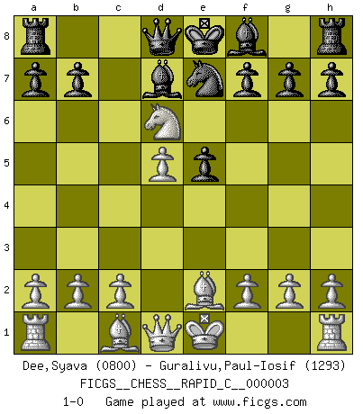 Last move : 1-0 2006 July 2 17:42:12 [Event "FICGS__CHESS__RAPID_C__000003"] [Site "FICGS"] [Date "2006.06.08"] [Round "1"] [White "Dee,Syava"] [Black "Guralivu,Paul-Iosif"] [Result "1-0"] [WhiteElo "0800"] [BlackElo "1293"] 1.e4 c5 2.Nf3 Nc6 3.d4 cxd4 4.Nxd4 e5 5.Nb5 d6 6.N1c3 Nf6 7.Nd5 Nxd5 8.exd5 Ne7 9.Be2 Bd7 10.Nxd6 1-0 Sicilian : Labourdonnais-Loewenthal (Kalashnikov) variation Player White won this chess game. Follow this game move after move (download)Chess is life. (Bobby Fischer) Stil? Ich habe keinen Stil! (Anatoly Karpov) El Ajedrez es un invernadero donde los frutos del carácter pueden madurar mas completamente que en la vida. (Edward Morgan Foster) Si rien de grave n'est détecté lors de l'analyse d'une position, on joue alors le coup. Seconde règle de Blumenfeld. Whenever people agree with me, I always feel I must be wrong. (Oscar Wilde)