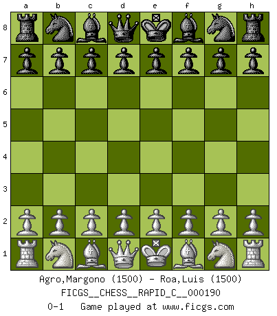 Last move : 0-1 2018 November 9 10:15:8 [Event "FICGS__CHESS__RAPID_C__000190"] [Site "FICGS"] [Date "2018.10.10"] [Round "1"] [White "Agro,Margono"] [Black "Roa,Luis"] [Result "0-1"] [WhiteElo "1500"] [BlackElo "1500"] 0-1 This chess game has been lost on time (started : 2018.10.10 2:7:11) Player Black won this chess game. Follow this game move after move (download)A great player and a great example for many. His book My 60 Memorable Games had a big impact on me. It is a shame he didn't continue to enrich the world of chess with his unparalleled understanding after 1972. (Jan Timman, about Bobby Fischer's death) Ich bin es gewohnt, das die Jugend mir überhaupt keinen Respekt entgegenbringt. (Alexander Morozewich) Dejen al perfeccionista jugar por correo. (Yasser Seirawan) On entre au jeu d'Echecs comme on entre en Religion. Pour le joueur d'Echecs, la partie d'Echecs c'est l'office, la messe, le défilé du 1er Mai, le dépôt de gerbe au Monument aux Morts. C'est un drame sacré. (Michel Roos) If we knew what we were doing, we would not call it research. (Albert Einstein)