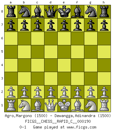 Last move : 0-1 2018 November 9 10:15:8 [Event "FICGS__CHESS__RAPID_C__000190"] [Site "FICGS"] [Date "2018.10.10"] [Round "1"] [White "Agro,Margono"] [Black "Dewangga,Adinandra"] [Result "0-1"] [WhiteElo "1500"] [BlackElo "1500"] 0-1 This chess game has been lost on time (started : 2018.10.10 2:7:11) Player Black won this chess game. Follow this game move after move (download)You cannot play at Chess if you are kind-hearted. (French Proverb) Ein Springer auf f6 gegen die eigene Rochadestellung ist schlimmer als ein rostiger Nagel im Knie. (Efim Bogoljubov) Fischer sacrificó virtualmente todo lo que la mayoría de nosotros los 'debiles' (término que él usa) valoramos, respetamos y apreciamos por el amor de un astuto, a menudo hermoso tablero de juego, por el privilegio ambivalente de ser su mas grande maestro. (Paul Kollar) Le moment que je préfère le plus dans une rencontre, c'est celui où je sens que la personnalité de l'adversaire se brise. (Robert Fischer) Think like a man of action, act like a man of thought. (Henri Louis Bergson)