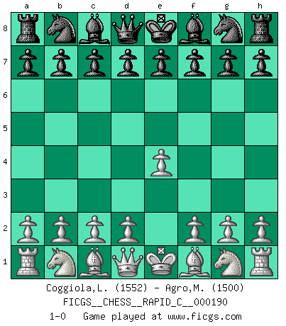 Last move : 1-0 2018 November 9 22:17:10 [Event "FICGS__CHESS__RAPID_C__000190"] [Site "FICGS"] [Date "2018.10.10"] [Round "1"] [White "Coggiola,Leandro Damian"] [Black "Agro,Margono"] [Result "1-0"] [WhiteElo "1552"] [BlackElo "1500"] 1.e4 1-0 This chess game has been lost on time (started : 2018.10.10 2:7:11) King's pawn Opening Player White won this chess game. Follow this game move after move (download)The stomach is an essential part of the Chess master. (Bent Larsen) Modernes Schach erfordert enorme Anspannung. Es ist für einen normalen Menschen unmöglich das auszuhalten. (Viktor Kortschnoi) El juego de Damas es para vagabundos. (Paul Morphy) Demandez au pauvre Cg1 ce qu'il en pense. Eduard Gufeld à propos de la variante Saemisch de l'Est-Indienne. Winning isn't everything... but losing is nothing. (Mednis)