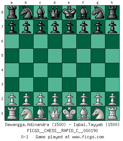 Last move : 0-1 2018 November 9 10:15:8 [Event "FICGS__CHESS__RAPID_C__000190"] [Site "FICGS"] [Date "2018.10.10"] [Round "1"] [White "Dewangga,Adinandra"] [Black "Iqbal,Tayyab"] [Result "0-1"] [WhiteElo "1500"] [BlackElo "1500"] 0-1 This chess game has been lost on time (started : 2018.10.10 2:7:11) Player Black won this chess game. Follow this game move after move (download)Nowadays, when you're not a grandmaster at 14, you can forget about it. (Anand Viswanathan) Es war undenkbar für die Behörden, dass ein sowjetischer Großmeister auf diese Art und Weise [Fischer-Taimanov 6:0] verliert, ohne dass es eine politischer Erklärung dafür gäbe. (Mark Taimanov) Realmente no sabemos como el juego fue inventado, aunque hay sospechas. Tan pronto como descubramos a los culpables, se los haremos saber. (Bruce Pandolfini) Lorsque vous vous retrouvez devant une position atroce, ne tendez pas un ultime piège dérisoire avec l'intention d'abandonner si l'adversaire le déjoue ! Faites-vous plutôt un devoir de résister comme si votre vie en dépendait. Jouez le coup qui vous déplairait au centuple si vous étiez dans la peau de votre tortionnaire ! The only sure thing about luck is that it will change. (Wilson Mizner)