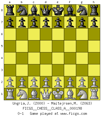 Last move : 0-1 2018 November 22 11:19:21 [Event "FICGS__CHESS__CLASS_A__000198"] [Site "FICGS"] [Date "2018.10.13"] [Round "1"] [White "Ungria,Joselito"] [Black "Maitejrsen,Maite"] [Result "0-1"] [WhiteElo "2000"] [BlackElo "2063"] 0-1 This chess game has been lost on time (started : 2018.10.13 4:38:30) Player Black won this chess game. Follow this game move after move (download)By playing at Chess then, we may learn: First: Foresight... Second: Circumspection... Third: Caution... And lastly, we learn by Chess the habit of not being discouraged by present bad appearances in the state of our affairs, the habit of hoping for a favorable chance, and that of persevering in the secrets of resources. (Benjamin Franklin) Ein Teil des Fehlers ist immer korrekt. (Savielly Grigorievitsch Tartakower) La vida es como el Ajedrez, con lucha, competición y eventos buenos y malos. (Benjamin Franklin) Shah mat. Le roi est mort. Cri de fierté d'un joueur venant de terrasser son adversaire, courtoisement, sans effusion de sang. May the force be with you. (Han Solo in Star Wars ep.4)