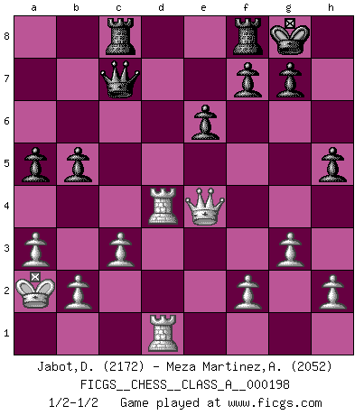 Last move : 1/2-1/2 2019 June 24 5:27:4 [Event "FICGS__CHESS__CLASS_A__000198"] [Site "FICGS"] [Date "2018.10.13"] [Round "1"] [White "Jabot,Daniel"] [Black "Meza Martinez,Alcides Ivan"] [Result "1/2-1/2"] [WhiteElo "2172"] [BlackElo "2052"] 1.e4 e6 2.d4 d5 3.Nd2 dxe4 4.Nxe4 Nd7 5.Nf3 Ngf6 6.Nxf6+ Nxf6 7.Bd3 c5 8.Be3 Qc7 9.Qe2 Be7 10.O-O-O Bd7 11.Ne5 O-O 12.Nxd7 Nxd7 13.c3 cxd4 14.Bxd4 Bf6 15.Be3 Rac8 16.Be4 Ne5 17.Bd4 Nd7 18.Kb1 Bxd4 19.Rxd4 Nf6 20.Rhd1 Nxe4 21.Qxe4 b5 22.g3 a5 23.a3 h5 24.Ka2 1/2-1/2 French : Tarrasch Queenside Castling by player White (move 10) Kingside Castling by player Black (move 11) This chess game ended in a draw. Follow this game move after move (download)It was clear to me that the vulnerable point of the American Grandmaster (Bobby Fischer) was in double-edged, hanging, irrational positions, where he often failed to find a win even in a won position. (Efim Geller) Kritik überlasse ich den Spießern. Ich zeige nichts, wofür ich mich schämen muss. (Alexandra Kosteniuk) El Ajedrez es una manera fabulosa para que los niños aprendan a autovalorarse y a autoestimarse. (Saudin Robovic) D'abord les bases : Jouez et étudiez, puis étudiez et jouez, ensuite jouez et étudiez, puis étudiez et jouez. Deuxièmement : Donnez toujours le meilleur de vous-même ! (Ken Smith) All politicians must be presumed guilty until they are proven innocent. (Dinesh De Silva)