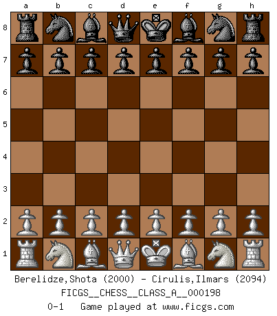 Last move : 0-1 2018 November 22 11:19:21 [Event "FICGS__CHESS__CLASS_A__000198"] [Site "FICGS"] [Date "2018.10.13"] [Round "1"] [White "Berelidze,Shota"] [Black "Cirulis,Ilmars"] [Result "0-1"] [WhiteElo "2000"] [BlackElo "2094"] 0-1 This chess game has been lost on time (started : 2018.10.13 4:38:30) Player Black won this chess game. Follow this game move after move (download)Play the opening like a book, the middle game like a magician, and the endgame like a machine. (Spielmann) Die Fehler sind da, Sie warten nur darauf gemacht zu werden. (Savielly Grigorievitsch Tartakower) No puedes jugar al Ajedrez si eres de corazón noble. (Proverbio Francés) Les Echecs sont affaire de jugement sensible. Savoir quand frapper et quand esquiver. (Fischer) If things go wrong, don't go with them. (Roger Babson)