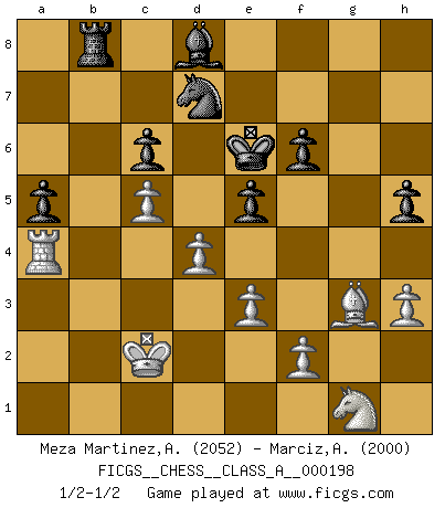 Last move : 1/2-1/2 2019 May 8 5:52:49 [Event "FICGS__CHESS__CLASS_A__000198"] [Site "FICGS"] [Date "2018.10.13"] [Round "1"] [White "Meza Martinez,Alcides Ivan"] [Black "Marciz,Alexander"] [Result "1/2-1/2"] [WhiteElo "2052"] [BlackElo "2000"] 1.d4 d5 2.Nf3 c6 3.Bf4 Qb6 4.Nbd2 Nf6 5.Qc1 Bf5 6.c4 Nbd7 7.e3 e6 8.Be2 a5 9.O-O Be7 10.b3 O-O 11.Qb2 h6 12.h3 Ne4 13.Nxe4 Bxe4 14.Rac1 Rfe8 15.Rfd1 Bf6 16.a4 Qb4 17.Qa2 Be7 18.Bd3 Bxd3 19.Rxd3 Bf8 20.Qe2 b5 21.Qd1 dxc4 22.bxc4 Qxa4 23.Qxa4 bxa4 24.c5 f6 25.Bh2 e5 26.Ra3 Reb8 27.Rxa4 Rb4 28.Rca1 Rxa4 29.Rxa4 Kf7 30.Kf1 Be7 31.Ke2 Ke6 32.g4 g6 33.Bg3 h5 34.Kd1 Bd8 35.Kc2 Rb8 36.gxh5 gxh5 37.Ng1 1/2-1/2 Queen's pawn game Kingside Castling by player White (move 9) Kingside Castling by player Black (move 10) This chess game ended in a draw. Follow this game move after move (download)I thought the most common mistake [in chess] was the first one: Learning the game :P (Garvin Gray, FICGS forum) Nach Morphy wurde nichts neues mehr in der Behandlung offener Positionen gefunden. (Mikhail Moiseyevich Botvinik) Debes de llevar a tu oponente hacia un profundo y obscuro bosque donde 2+2=5, y el camino que conduce a la salida es suficientemente ancho para solamente uno. (Mikhail Tal) A chaque perte on perd un peu de soi. (Joël Lautier) A computer lets you make more mistakes faster than any invention in human history - with the possible exceptions of handguns and tequila. (Mitch Ratcliffe)