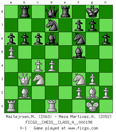 Last move : 0-1 2019 February 11 20:2:17 [Event "FICGS__CHESS__CLASS_A__000198"] [Site "FICGS"] [Date "2018.10.13"] [Round "1"] [White "Maitejrsen,Maite"] [Black "Meza Martinez,Alcides Ivan"] [Result "0-1"] [WhiteElo "2063"] [BlackElo "2052"] 1.b3 d5 2.Bb2 Bf5 3.e3 Nf6 4.Nf3 e6 5.c4 h6 6.Nc3 c6 7.d4 Bb4 8.a3 Bd6 9.g3 Nbd7 10.Bg2 O-O 11.O-O dxc4 12.bxc4 e5 13.a4 Re8 14.a5 a6 15.Qb3 Rb8 16.Rfd1 exd4 17.exd4 b6 0-1 Nimzovich-Larsen attack : Classical variation Kingside Castling by player Black (move 10) Kingside Castling by player White (move 11) Player Black won this chess game. Follow this game move after move (download)By this measure (on the gap between Fischer & his contemporaries), I consider him the greatest world champion. (Garry Kasparov) Stelle das Brett so, daß die Sonne in die Augen deines Gegners scheint. (Ruy López) Todavía soy una víctima del Ajedrez. Tiene toda la belleza del arte y mucho mas. No puede ser comercializado. El Ajedrez es mas puro que el arte en su posición social. (Marcel Duchamp) En blitz, le Cavalier l'emporte sur le Fou. (Vlastimil Hort) To steal ideas from one person is plagiarism. To steal from many is research. (Unknown)