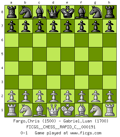 Last move : 0-1 2018 November 15 22:38:38 [Event "FICGS__CHESS__RAPID_C__000191"] [Site "FICGS"] [Date "2018.10.16"] [Round "1"] [White "Fargo,Chris"] [Black "Gabriel,Luan"] [Result "0-1"] [WhiteElo "1500"] [BlackElo "1700"] 0-1 This chess game has been lost on time (started : 2018.10.16 20:48:54) Player Black won this chess game. Follow this game move after move (download)You must take your opponent into a deep dark forest where 2+2=5, and the path leading out is only wide enough for one. (Mikhail Tal) Wer nie einen Fehler gemacht hat, hat nie etwas Neues ausprobiert. (Albert Einstein) El Ajedrez, como cualquier otra actividad creativa, puede existir solo a través de méritos combinados de aquellos que tienen talento creativo y de aquellos que tienen la habilidad de organizar un trabajo creativo. (Mikhail Botvinnik) Le pion, dans sa simplicité, marche droit devant lui, mais lorsqu'il prend, il le fait obliquement? Ainsi l'homme, tant qu'il reste pauvre, marche dans la droiture et vit honnêtement, mais lorsqu'il recherche les honneurs, il flatte, se parjure et, par les voies obliques, cherche une position supérieure sur l'échiquier du monde. (Jean de Galles) I teach you to lie, cheat and steal, and as soon as my back's turned you wait in line ? (Gregory House, House M.D.)
