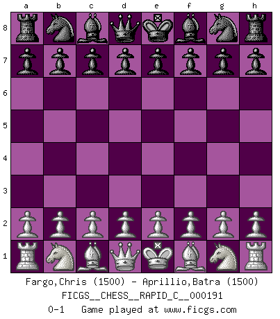 Last move : 0-1 2018 November 15 22:38:38 [Event "FICGS__CHESS__RAPID_C__000191"] [Site "FICGS"] [Date "2018.10.16"] [Round "1"] [White "Fargo,Chris"] [Black "Aprillio,Batra"] [Result "0-1"] [WhiteElo "1500"] [BlackElo "1500"] 0-1 This chess game has been lost on time (started : 2018.10.16 20:48:54) Player Black won this chess game. Follow this game move after move (download)After black's reply to 1.e4 with 1..e5, leaves him always trying to get into the game. (Howard Staunton) Gott hat gewollt, dass ich Champion werde. (Surab Azmajparaschvili) Alekhine es un poeta que crea un trabajo de arte de algo que raramente inspiraría a otra persona a mandar una tarjeta postal. (Max Euwe) J'ai vu le vaincu d'Echecs jouer des années durant dans l'espoir de la fête de la victoire. Car tu es plus riche de ce qu'elle existe si même elle n'est point pour toi. Ainsi de la perle du fond des mers. (Antoine de Saint-Exupéry) Hardware: the parts of a computer that can be kicked. (Jeff Persis)