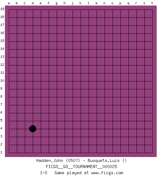 Last move : 1-0 2018 November 15 22:38:38 [Event "FICGS__GO__TOURNAMENT__000025"] [Site "FICGS"] [Date "2018.10.16"] [Round "1"] [Black "Hadden,John"] [White "Busquets,Luis"] [Result "1-0"] [Rating 1 "0507"] 1.d4 1-0 This go game has been lost on time (started : 2018.10.16 20:51:9) Here are the names of the openings (joseki) played in the four corners : Corner d4 : d4 1-0 Hoshi (Hwajeom, Seongjeom, Xingwei`) 4-4 Point. The star or hoshi (4-4) point, emphasizing influence at the potential expense of territory. Player Black won this Go (weiqi, baduk) game. Follow this game move after move (download)The intersection is rarely neutral. (Pierre Audouard) Political correctness is subjecting us to gross incompetence. (Johann Piek)
