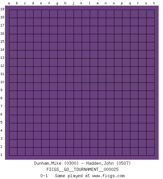 Last move : 0-1 2018 November 15 22:38:38 [Event "FICGS__GO__TOURNAMENT__000025"] [Site "FICGS"] [Date "2018.10.16"] [Round "1"] [Black "Dunham,Mike"] [White "Hadden,John"] [Result "0-1"] [Rating 1 "0300"] [Rating 2 "0507"] 0-1 This go game has been lost on time (started : 2018.10.16 20:51:9) Here are the names of the openings (joseki) played in the four corners : Player White won this Go (weiqi, baduk) game. Follow this game move after move (download)While the Baroque rules of chess could only have been created by humans, the rules of go are so elegant, organic, and rigorously logical that if intelligent life forms exist elsewhere in the universe, they almost certainly play go. (Edward Lasker, international chess master) A good teacher is like a candle - it consumes itself to light the way for others. (Author unknown)