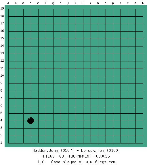 Last move : 1-0 2018 November 15 22:38:38 [Event "FICGS__GO__TOURNAMENT__000025"] [Site "FICGS"] [Date "2018.10.16"] [Round "1"] [Black "Hadden,John"] [White "Leroux,Tom"] [Result "1-0"] [Rating 1 "0507"] [Rating 2 "0100"] 1.d4 1-0 This go game has been lost on time (started : 2018.10.16 20:51:9) Here are the names of the openings (joseki) played in the four corners : Corner d4 : d4 1-0 Hoshi (Hwajeom, Seongjeom, Xingwei`) 4-4 Point. The star or hoshi (4-4) point, emphasizing influence at the potential expense of territory. Player Black won this Go (weiqi, baduk) game. Follow this game move after move (download)When you study joseki, you lose two stones in strength. (Anonymous) Horse racing is animated roulette. (Roger Kahn)