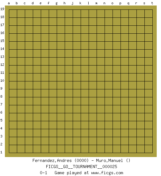 Last move : 0-1 2018 November 15 22:38:38 [Event "FICGS__GO__TOURNAMENT__000025"] [Site "FICGS"] [Date "2018.10.16"] [Round "1"] [Black "Fernandez,Andres"] [White "Muro,Manuel"] [Result "0-1"] [Rating 1 "0000"] 0-1 This go game has been lost on time (started : 2018.10.16 20:51:9) Here are the names of the openings (joseki) played in the four corners : Player White won this Go (weiqi, baduk) game. Follow this game move after move (download)Learning josekis by heart is useless if you don't try departing from them. (Pierre Audouard) When you have everything, sometimes it feels like nothing. (Horatio Caine, C.S.I. Miami)