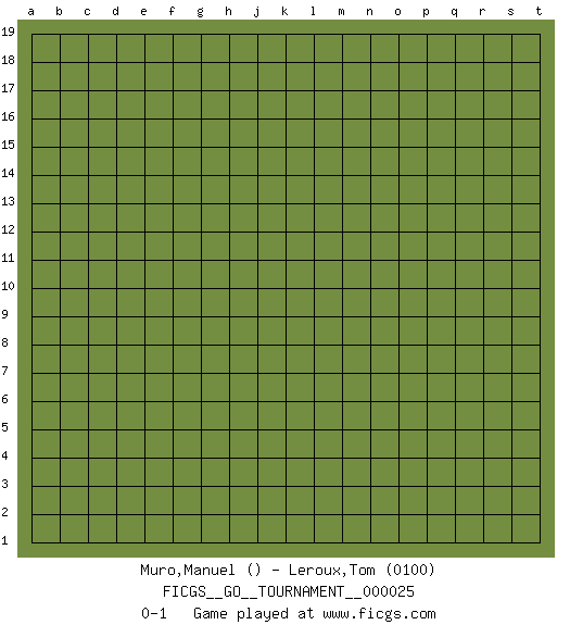 Last move : 0-1 2018 November 15 22:38:38 [Event "FICGS__GO__TOURNAMENT__000025"] [Site "FICGS"] [Date "2018.10.16"] [Round "1"] [Black "Muro,Manuel"] [White "Leroux,Tom"] [Result "0-1"] [Rating 2 "0100"] 0-1 This go game has been lost on time (started : 2018.10.16 20:51:9) Here are the names of the openings (joseki) played in the four corners : Player White won this Go (weiqi, baduk) game. Follow this game move after move (download)Play slow, win slow; play fast, lose fast. (Anonymous) Creativity is inventing, experimenting, growing, taking risks, breaking rules, making mistakes, and having fun. (Mary Lou Cook)
