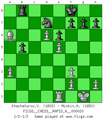 Last move : 1/2-1/2 2007 August 16 21:32:29 [Event "FICGS__CHESS__RAPID_A__000020"] [Site "FICGS"] [Date "2007.05.22"] [Round "1"] [White "Khachaturov,Vadim"] [Black "Minkin,Alexander"] [Result "1/2-1/2"] [WhiteElo "1803"] [BlackElo "1850"] 1.d4 Nf6 2.c4 e6 3.Nc3 Bb4 4.Nf3 c5 5.e3 O-O 6.Bd3 d5 7.O-O Nbd7 8.a3 Bxc3 9.bxc3 dxc4 10.Bxc4 b6 11.Bd3 Bb7 12.Re1 Be4 13.Bf1 Bc6 14.Nd2 b5 15.Rb1 a6 16.e4 cxd4 17.cxd4 Nb6 18.Bb2 Rc8 19.Rc1 Bb7 20.Rxc8 Qxc8 21.Bd3 Qc7 22.d5 Qd8 23.Bxf6 Qxf6 24.e5 Qg5 25.Nf3 Qh5 26.d6 Bxf3 27.Qxf3 Qxf3 28.gxf3 Rc8 29.Be4 Kf8 30.Bb7 Rb8 31.Bxa6 Nd7 1/2-1/2 Nimzo-Indian : Three knights variation Kingside Castling by player Black (move 5) Kingside Castling by player White (move 7) This chess game ended in a draw. Follow this game move after move (download)We must make sure that Chess will not be like a dead language, very interesting, but for a very small group. (Sytze Faber) Schach ist mein Leben, meine Leidenschaft, was ich gelernt habe und seit meinem 14. Lebensjahr profimässig praktiziere. Darauf zu verzichten, würde mir sehr schwer fallen. (Viktor Kortschnoi) Con el tiempo, empecé a progresar en partidas decisivas. Tal vez porque me di cuenta de una simple verdad: no solo estaba yo nervioso sino también mi oponente. (Mikhail Tal) Des points faibles ou des trous dans la position de l'adversaire doivent être occupés par des pièces et non pas par des pions. (Siegbert Tarrasch) As the days dwindle down... to a precious few. (Maxwell Anderson)