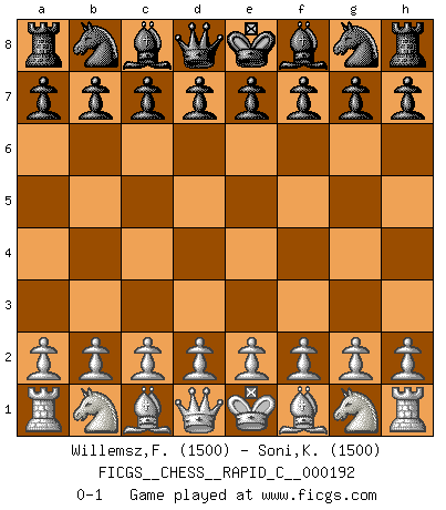Last move : 0-1 2018 November 15 22:38:38 [Event "FICGS__CHESS__RAPID_C__000192"] [Site "FICGS"] [Date "2018.10.16"] [Round "1"] [White "Willemsz,Fabian"] [Black "Soni,Kanhaiyalal"] [Result "0-1"] [WhiteElo "1500"] [BlackElo "1500"] 0-1 This chess game has been lost on time (started : 2018.10.16 20:52:32) Player Black won this chess game. Follow this game move after move (download)Your body has to be in top condition. Your Chess deteriorates as your body does. You can't separate body from mind. (Bobby Fischer) Konzentriere dich auf materielle Gewinne. Nimm, was dir dein Gegner gibt, ausser es gibt einen guten Grund der dagegenspricht. (Robert James Fischer) En posiciones complicadas, Bobby Fischer pocas veces tuvo que temer de cualquiera. (Paul Keres) On n'a jamais que l'âge auquel on a commence à jouer aux échecs car après on cesse de vieillir. (Capablanca) Good luck. You're gonna need it. (Han Solo in Star Wars ep.6)