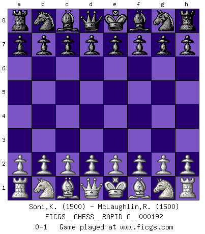 Last move : 0-1 2018 November 15 22:38:38 [Event "FICGS__CHESS__RAPID_C__000192"] [Site "FICGS"] [Date "2018.10.16"] [Round "1"] [White "Soni,Kanhaiyalal"] [Black "McLaughlin,Russell"] [Result "0-1"] [WhiteElo "1500"] [BlackElo "1500"] 0-1 This chess game has been lost on time (started : 2018.10.16 20:52:32) Player Black won this chess game. Follow this game move after move (download)I have always a slight feeling of pity for the man who has no knowledge of Chess. (Siegbert Tarrasch) Besser ein falscher Plan, logisch durchgeführt, als gar kein Plan. (Viktor Kortschnoi) La partida mas dura de ganar es una partida ganada. (Emanuel Lasker) Mais l'homme est une créature légère et illogique : semblable au joueur d'échecs, il n'aime que le processus du but à atteindre, non le but lui-même. (Dostoïevsky) It is not titles that honor men, but men that honor titles. (Niccolo Machiavelli)