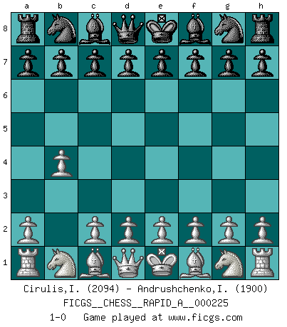 Last move : 1-0 2018 November 16 10:55:4 [Event "FICGS__CHESS__RAPID_A__000225"] [Site "FICGS"] [Date "2018.10.17"] [Round "1"] [White "Cirulis,Ilmars"] [Black "Andrushchenko,Ivan"] [Result "1-0"] [WhiteElo "2094"] [BlackElo "1900"] 1.b4 1-0 This chess game has been lost on time (started : 2018.10.17 7:27:1) Polish (Sokolsky) opening Player White won this chess game. Follow this game move after move (download)Best by test: 1. e4 (Bobby Fischer) Im Hotelzimmer gab es nur zwei Schaben. (Über die Turnierbedingungen) (Peter Swidler) Una buena ofensiva y una buena defensa, comienzan ambas con un buen desarrollo. (Bruce A. Moon) Nous vivons dans un monde échiquéen : chaque jour qui passe est un défi à relever. (Philosophe Sasha) I teach you to lie, cheat and steal, and as soon as my back's turned you wait in line ? (Gregory House, House M.D.)