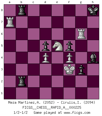 Last move : 1/2-1/2 2019 May 14 18:58:11 [Event "FICGS__CHESS__RAPID_A__000225"] [Site "FICGS"] [Date "2018.10.17"] [Round "1"] [White "Meza Martinez,Alcides Ivan"] [Black "Cirulis,Ilmars"] [Result "1/2-1/2"] [WhiteElo "2052"] [BlackElo "2094"] 1.d4 f5 2.Nf3 Nf6 3.g3 e6 4.Bg2 Be7 5.O-O O-O 6.c4 d5 7.Nc3 c6 8.Qc2 Ne4 9.b3 Nd7 10.e3 g5 11.a4 g4 12.Ne1 h5 13.Ne2 h4 14.Nf4 hxg3 15.hxg3 Rf6 16.Ned3 Rh6 17.Bb2 Bg5 18.Rfd1 a5 19.Kf1 b5 20.axb5 cxb5 21.cxd5 exd5 22.Rdc1 Nb6 23.Bc3 b4 24.Be1 Qe8 25.Kg1 Bd7 26.Ra2 Bb5 27.Rca1 a4 28.Qb1 a3 29.Bxb4 Nxg3 30.Bc5 Rd8 31.Bxb6 Rxb6 32.b4 Ne4 33.Rxa3 Rh6 34.Qc2 Bh4 35.Ra7 g3 36.f3 Rc6 37.Qb1 Nd2 38.Qe1 Bxd3 39.Nxd3 Nc4 40.b5 Rb6 41.f4 Qxe3+ 42.Qxe3 Nxe3 43.Re1 Nxg2 44.Kxg2 Rxb5 45.Re6 Rb3 46.Ne5 Rb2+ 47.Kf3 Rdb8 48.Rg6+ Kh8 1/2-1/2 Dutch Kingside Castling by player White (move 5) Kingside Castling by player Black (move 5) This chess game ended in a draw. Follow this game move after move (download)Excellence at Chess is one mark of a scheming mind. (Sir Arthur Conan Doyle) Ihnen, Herr Lasker, habe ich nur drei Worte zu sagen: Schach und matt. (Siegbert Tarrasch) Tu eres para mi la Reina en d8 y yo soy el Peón en d7!!. (GM Eduard Gufeld) Les échecs sont utiles à l'exercice de la faculté de penser et à celle de l'imagination. Car nous devons posséder une méthode élaborée pour atteindre des buts partout où nous devons conduire notre raison. (Leibnitz) Waiting for chance ? Play in casinos. (FICGS proverb)