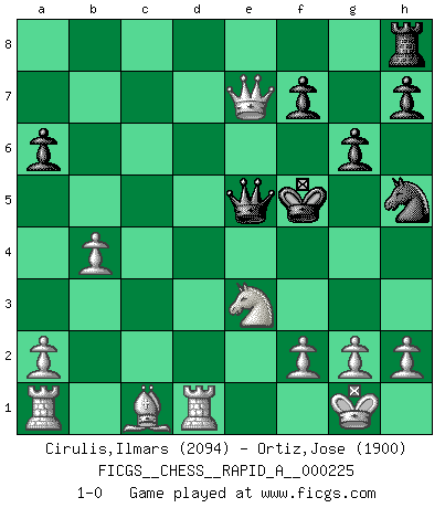 Last move : 1-0 2019 February 21 19:17:12 [Event "FICGS__CHESS__RAPID_A__000225"] [Site "FICGS"] [Date "2018.10.17"] [Round "1"] [White "Cirulis,Ilmars"] [Black "Ortiz,Jose"] [Result "1-0"] [WhiteElo "2094"] [BlackElo "1900"] 1.b4 Nf6 2.c4 d5 3.cxd5 b5 4.e4 Nbd7 5.Bxb5 a6 6.Bc6 Rb8 7.Nc3 g6 8.e5 Nh5 9.e6 Rb6 10.exd7+ Bxd7 11.Bxd7+ Qxd7 12.Nf3 c6 13.Ne5 Qf5 14.d4 cxd5 15.Qa4+ Kd8 16.O-O Bg7 17.Qa5 Qe6 18.Nxd5 Bxe5 19.dxe5 Qxe5 20.Qxb6+ Kd7 21.Qb7+ Kd6 22.Rd1 Ke6 23.Qxe7+ Kf5 24.Ne3+ 1-0 Polish (Sokolsky) opening Kingside Castling by player White (move 16) Player White won this chess game. Follow this game move after move (download)We must make sure that Chess will not be like a dead language, very interesting, but for a very small group. (Sytze Faber) Mein erstes Ziel war nicht, die Partie zu gewinnen, sondern eine Figur zu opfern. -- der junge (Wilhelm Steinitz) No hay otro maestro que tenga una voluntad terrífica de ganar. Al tablero, el irradía peligro y aún los oponentes mas fuertes tienden a congelarse como liebres cuando olfatean a una pantera. Aún sus debilidades son peligrosas. Con las blancas, su juego de apertura es predecible - te es posible hacer planes en su contra - pero es tan fuerte que tus planes casi nunca funcionan. En el juego medio, su precisión e invención son fabulosas y en finales, tú simplemente no le puedes vencer. (Experto Alemán anónimo) Votre seul travail dans les ouvertures est d'obtenir un milieu de partie jouable. (Lajos Portish) Somewhere in the world there is an epigram for every dilemma. (Hendrik Willem van Loon)