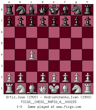 Last move : 1-0 2018 November 17 11:0:59 [Event "FICGS__CHESS__RAPID_A__000225"] [Site "FICGS"] [Date "2018.10.17"] [Round "1"] [White "Ortiz,Jose"] [Black "Andrushchenko,Ivan"] [Result "1-0"] [WhiteElo "1900"] [BlackElo "1900"] 1.c4 1-0 This chess game has been lost on time (started : 2018.10.17 7:27:1) English Opening Player White won this chess game. Follow this game move after move (download)The Pin is mightier than the sword. (Fred Reinfeld) Im Blitz ist es einfacher mit einer Figur weniger anzugreifen, als sich mit einer Mehrfigur zu verteidigen. (Mikhail Nekhemyevich Tal) Mi estilo es algo parecido entre un poco de Tal y Petrosian. (Reshevsky) Pour moi, les échecs ne sont pas un jeu mais un art. (Alexandre Alekhine) Every vice is only an exaggeration of a necessary and virtuous function. (Ralph Waldo Emerson, Journals 1936)