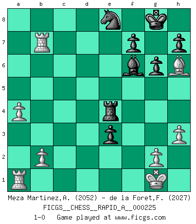 Last move : 1-0 2019 January 28 9:53:57 [Event "FICGS__CHESS__RAPID_A__000225"] [Site "FICGS"] [Date "2018.10.17"] [Round "1"] [White "Meza Martinez,Alcides Ivan"] [Black "de la Foret,Fred"] [Result "1-0"] [WhiteElo "2052"] [BlackElo "2027"] 1.d4 Nf6 2.Nf3 b6 3.Nbd2 Bb7 4.e3 e6 5.Bd3 Be7 6.e4 d6 7.O-O O-O 8.Re1 Nbd7 9.c3 c5 10.Nf1 Rc8 11.Ng3 cxd4 12.cxd4 Rc7 13.Be3 Qc8 14.Qe2 Qa8 15.Nd2 Rfc8 16.h3 a6 17.a4 a5 18.Rad1 g6 19.Bh6 Bc6 20.Ra1 Bb7 21.Nb1 e5 22.Nc3 exd4 23.Nb5 Ne8 24.Nxc7 Rxc7 25.Bb5 Bf6 26.Bxd7 Rxd7 27.Qb5 Rc7 28.Rec1 Re7 29.Qxb6 d5 30.Rc5 dxe4 31.Rxa5 Qb8 32.Ra7 e3 33.fxe3 dxe3 34.Ne4 Rxe4 35.Qxb7 Qxb7 36.Rxb7 1-0 Queen's Indian defense Kingside Castling by player White (move 7) Kingside Castling by player Black (move 7) Player White won this chess game. Follow this game move after move (download)Nowadays, when you're not a grandmaster at 14, you can forget about it. (Anand Viswanathan) Die Elozahlen sind sehr schlecht für das Schach. Jetzt ist Schach eine Sportindustrie, die darauf zielt Elopunkte zu machen. (Miguel Najdorf) En la perfecta combinación de Ajedrez como en una historia corta de primera clase, toda la trama y contra trama deberá conducir hacia un final sorprendente, el interes no es mitigado hasta el último momento. (Yates and Winter) On n'a jamais que l'âge auquel on a commence à jouer aux échecs car après on cesse de vieillir. (Capablanca) Men should grow up. - Yeah. And dogs should stop licking themselves. It's not gonna happen. (Gregory House to Dr. Cameron, House M.D.)