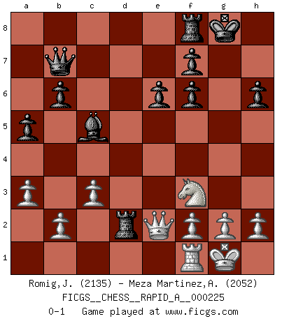 Last move : 0-1 2019 January 16 5:58:55 [Event "FICGS__CHESS__RAPID_A__000225"] [Site "FICGS"] [Date "2018.10.17"] [Round "1"] [White "Romig,James"] [Black "Meza Martinez,Alcides Ivan"] [Result "0-1"] [WhiteElo "2135"] [BlackElo "2052"] 1.e4 e6 2.d4 d5 3.Nc3 dxe4 4.Nxe4 Nd7 5.Nf3 Ngf6 6.Nxf6+ Nxf6 7.Bd3 c5 8.dxc5 Bxc5 9.Qe2 Qc7 10.c3 O-O 11.Bg5 b6 12.O-O Bb7 13.Bxf6 gxf6 14.Be4 Rad8 15.Bxb7 Qxb7 16.Rad1 a5 17.a3 h6 18.Rd2 Rxd2 0-1 French : Rubinstein variation Kingside Castling by player Black (move 10) Kingside Castling by player White (move 12) Player Black won this chess game. Follow this game move after move (download)Morphy was probably the greatest genius of them all. (Bobby Fischer) Das Schachspiel übertrifft alle anderen Spiele so weit wie der Chimborasso einen Misthaufen. (Arthur Schopenhauer) No volvere nunca a jugar contigo. Has insultado a mi amigo. - cuando un oponente se maldijo por una mala jugada (Miguel Najdorf) La vérité est comme le meilleur coup aux échecs : elle existe, mais il faut la chercher. (Arturo Perez-Reverte) Excelling at chess has long been considered a symbol of more general intelligence. That is an incorrect assumption in my view, as pleasant as it might be. But for the purposes of argument and investigation, chess is, in Russkin-Gutman's words, 'an unparalleled laboratory, since both the learning process and the degree of ability obtained can be objectified and quantified, providing an excellent comparative framework on which to use rigorous analytical techniques.' (The Chess Master and the Computer, by Garry Kasparov - 2010)