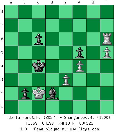 Last move : 1-0 2019 April 4 3:3:16 [Event "FICGS__CHESS__RAPID_A__000225"] [Site "FICGS"] [Date "2018.10.17"] [Round "1"] [White "de la Foret,Fred"] [Black "Shangareev,Mirzian"] [Result "1-0"] [WhiteElo "2027"] [BlackElo "1900"] 1.e4 e5 2.Nf3 Nf6 3.Nxe5 d6 4.Nf3 Nxe4 5.Nc3 Nxc3 6.dxc3 Be7 7.Bd3 Nd7 8.Be3 c6 9.O-O O-O 10.Re1 Re8 11.Qe2 Nf6 12.c4 Qa5 13.Bd2 Qh5 14.Bc3 Bg4 15.Bxf6 Bxf3 16.gxf3 gxf6 17.f4 Qxe2 18.Rxe2 Bf8 19.Re3 Rxe3 20.fxe3 Rd8 21.Kf2 d5 22.Rg1+ Kh8 23.cxd5 Rxd5 24.Rg3 Rh5 25.Kg2 b5 26.Be4 Rc5 27.Kf3 b4 28.b3 h6 29.Bd3 Bg7 30.Bc4 Kg8 31.Rg1 Ra5 32.Rd1 Rxa2 33.h4 Rxc2 34.Rd7 Rxc4 35.bxc4 a5 36.Ra7 b3 37.Rxa5 Kh7 38.Ra6 b2 39.Rb6 f5 40.h5 Kg8 41.Rb3 Kf8 42.Rb7 Ke8 43.Rb3 Bc3 44.Rb7 Kd8 45.Rb8+ Kd7 46.Rb3 Kd6 47.Ke2 Kd7 48.Kd3 Bf6 49.Kc2 Kc8 50.Rd3 Kc7 51.Kb1 Bh8 52.Ra3 Kb6 53.Ra8 Bg7 54.Kc2 Kc5 55.Ra7 Bc3 56.Rxf7 Kxc4 57.Rh7 Bd2 58.Rxh6 1-0 This chess game has been lost on time (started : 2018.10.17 7:27:1) Petrov : Nimzovich attack Kingside Castling by player White (move 9) Kingside Castling by player Black (move 9) 10 pieces endgame at move 58 : White KRPPP , Black KBPPP WHITE : King + 1 Rook 3 Pawns BLACK : King + 1 Bishop 3 Pawns Player White won this chess game. Follow this game move after move (download)It is not a move, even the best move that you must seek, but a realizable plan. (Eugene Znosko-Borovsky) Jeder Schachmeister war einmal ein Anfänger. (Irving Chernev) Un buen jugador siempre tiene buena suerte. (José Raúl Capablanca) L'action d'une oeuvre littéraire se déroule sur un champ de bataille. Les masques et les types du drame moderne correspondent aux pièces du jeu d'échecs. L'intrigue correspond aux coups et aux gambits, c'est à dire aux techniques du jeu telles qu'utilisées et interprétées par les joueurs. Les tactiques et les péripéties [mouvements] correspondent aux coups exécutés par l'adversaire. (Viktor Shklovsky) A cynic is a man who knows the price of everything but the value of nothing. (Oscar Wilde)