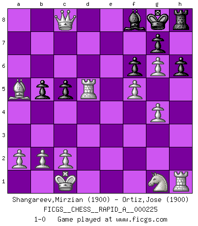Last move : 1-0 2018 December 13 23:7:15 [Event "FICGS__CHESS__RAPID_A__000225"] [Site "FICGS"] [Date "2018.10.17"] [Round "1"] [White "Shangareev,Mirzian"] [Black "Ortiz,Jose"] [Result "1-0"] [WhiteElo "1900"] [BlackElo "1900"] 1.e4 Nc6 2.d4 e6 3.d5 exd5 4.exd5 Qe7+ 5.Be2 Ne5 6.Nc3 d6 7.f4 Ng6 8.Qd3 Qf6 9.Qb5+ Kd8 10.Qc4 Bf5 11.Bd2 Rc8 12.O-O-O a6 13.g4 Bd7 14.g5 b5 15.Qb4 Qf5 16.h3 c5 17.Qa5+ Ke8 18.Bg4 Qxg4 19.hxg4 f6 20.Qxa6 h6 21.Re1+ N8e7 22.f5 Ne5 23.Ne4 Nxd5 24.Nxd6+ Ke7 25.Nxc8+ Kd8 26.Ba5+ Ke8 27.Rxe5+ Kf7 28.Rxd5 Bxc8 29.g6+ Kg8 30.Qxc8 1-0 KP : Nimzovich defense Queenside Castling by player White (move 12) Player White won this chess game. Follow this game move after move (download)The most powerful weapon in Chess is to have the next move. (David Bronstein) Warum muß ich gegen diesen IDIOTEN verlieren? (Aaron Nimzowitsch) Si tu oponente te ofrece un empate, trata de averiguar porque piensa él que esta en una posición peor. (Nigel Short) Echiquier : carré parfait, comme la Jérusalem nouvelle décrite par l'auteur de l'Apocalypse, huit cases sur huit, exaltation du chiffre 4, symbole du cosmos aux quatre horizons... où le noir et le blanc, l'ombre et la lumière, le mal et le bien s'entremêlent et se conjuguent. (Robert Couffignal, Le Gambit du poète) Question: Is 'This statement is paradoxical' a paradoxical statement ? Or is it a meta-paradox ? (Normajean Yates)