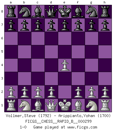 Last move : 1-0 2018 November 18 11:1:21 [Event "FICGS__CHESS__RAPID_B__000299"] [Site "FICGS"] [Date "2018.10.19"] [Round "1"] [White "Vollmer,Steve"] [Black "Arippianto,Yohan"] [Result "1-0"] [WhiteElo "1792"] [BlackElo "1700"] 1.e4 1-0 This chess game has been lost on time (started : 2018.10.19 2:17:51) King's pawn Opening Player White won this chess game. Follow this game move after move (download)Fischer Chess play was always razor-sharp, rational and brilliant. One of the best ever. (Dave Regis) Offener Brief an US-Präsident Bush anlässlich der Verhaftung Bobby Fishers: Verhaften Sie mich. Stecken Sie mich in dieselbe Zelle wie Bobby Fisher und geben Sie uns ein Schachspiel mit. (Boris Vassilievich Spassky) Estaba muy claro de que el punto vulnerable del Gran Maestro Americano (Bobby Fischer) radicaba en las posiciones de doble filo, colgantes, irracionales, donde el siempre falló en encontrar un triunfo aún en una posición de clara victoria. (Efim Geller) L'attaque fait le spectacle, la défense gagne les matchs. (Dicton footballistique) There is no vagueness without wind. (Chinese proverb)