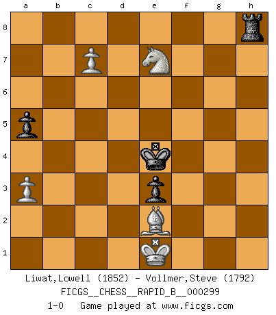 Last move : 1-0 2018 November 1 12:4:4 [Event "FICGS__CHESS__RAPID_B__000299"] [Site "FICGS"] [Date "2018.10.19"] [Round "1"] [White "Liwat,Lowell"] [Black "Vollmer,Steve"] [Result "1-0"] [WhiteElo "1852"] [BlackElo "1792"] 1.b4 e5 2.a3 d5 3.Bb2 Nd7 4.e3 Ngf6 5.c4 c6 6.c5 Be7 7.Be2 O-O 8.g4 Qc7 9.g5 Ne4 10.h4 f5 11.d3 Nxf2 12.Kxf2 e4 13.Nh3 Ne5 14.Bxe5 Qxe5 15.d4 Qc7 16.Nf4 b6 17.Nc3 Bd7 18.Na4 Rad8 19.Qb3 g6 20.Rag1 bxc5 21.dxc5 Kg7 22.h5 Qe5 23.hxg6 hxg6 24.Rh6 Be8 25.b5 Rb8 26.Nc3 Bxg5 27.Rxg6+ Bxg6 28.Rxg5 Rf6 29.Nh5+ Kh6 30.Nxf6 Kxg5 31.Nd7 Qh2+ 32.Ke1 Rb7 33.Qa4 Be8 34.Nf8 Qe5 35.Kd2 f4 36.exf4+ Qxf4+ 37.Kc2 cxb5 38.Ne6+ Kf5 39.Nxf4 bxa4 40.Nfxd5 Bc6 41.Nb4 Rc7 42.Kd2 a5 43.Nxc6 Rxc6 44.Nxa4 Kf4 45.Bb5 Rc7 46.c6 Kf3 47.Ke1 e3 48.Nc3 Rh7 49.Be2+ Kf4 50.c7 Rh8 51.Nd5+ Ke4 52.Ne7 1-0 Polish (Sokolsky) opening Kingside Castling by player Black (move 7) 10 pieces endgame at move 43 : White KBNPP , Black KRPPP WHITE : King + 1 Bishop 1 Knight 2 Pawns BLACK : King + 1 Rook 3 Pawns 9 pieces endgame at move 44 : White KBNPP , Black KRPP WHITE : King + 1 Bishop 1 Knight 2 Pawns BLACK : King + 1 Rook 2 Pawns Player White won this chess game. Follow this game move after move (download)I am the best player in the world and I am here to prove it. (Bobby Fischer) Die Neutralität betrachte ich als eine schwere Krankheit. (Viktor Kortschnoi) El arma más poderosa en el Ajedrez, es tener la próxima movida. (David Bronstein) Avant la finale, les dieux ont créé le milieu de partie. (Tarrasch) Train yourself to let go of everything you fear to lose. (Master Yoda in Star Wars ep.3)