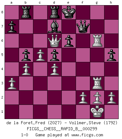 Last move : 1-0 2018 December 30 12:15:51 [Event "FICGS__CHESS__RAPID_B__000299"] [Site "FICGS"] [Date "2018.10.19"] [Round "1"] [White "de la Foret,Fred"] [Black "Vollmer,Steve"] [Result "1-0"] [WhiteElo "2027"] [BlackElo "1792"] 1.d4 d5 2.c4 e6 3.Nc3 Nf6 4.Nf3 c6 5.e3 Bd6 6.Bd3 Nbd7 7.e4 dxe4 8.Nxe4 Nxe4 9.Bxe4 Nf6 10.Bc2 O-O 11.Qd3 h6 12.O-O Qc7 13.c5 Bf4 14.Bxf4 Qxf4 15.Ne5 Rd8 16.Rad1 h5 17.Rfe1 Qh6 18.Qf3 Bd7 19.a3 Be8 20.Nc4 Nd5 21.Nd6 Rab8 22.b4 b5 23.Bb3 Ne7 24.Re5 g6 25.Qf6 Nd5 26.Bxd5 cxd5 27.Rde1 Qg7 28.Qh4 Bc6 29.R1e3 Qh7 30.Rg3 Kf8 31.Qf6 Bd7 32.Reg5 Qg7 33.Qf4 Ke7 34.Nxf7 Qxf7 35.Qd6+ Ke8 36.Rxg6 1-0 QGD Semi-Slav : 5.e3 Kingside Castling by player Black (move 10) Kingside Castling by player White (move 12) Player White won this chess game. Follow this game move after move (download)For surely of all the drugs in the world, Chess must be the most permanently pleasurable. (Assiac) Der Partner hat auch seine Existenzberechtigung. (Savielly Grigorievitsch Tartakower) El Ajedrez expande y enriquece tu mente. (Saudin Robovic) Celui qui prend des risques peut perdre, celui qui n'en prend pas perd toujours. (Xavier Tartacover) It is a good thing for an uneducated man to read books of quotations. (Winston Churchill)