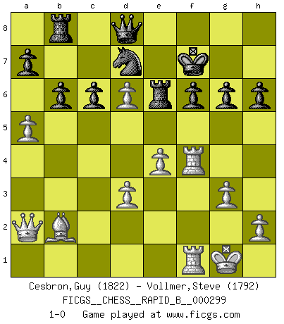 Last move : 1-0 2018 December 22 11:40:49 [Event "FICGS__CHESS__RAPID_B__000299"] [Site "FICGS"] [Date "2018.10.19"] [Round "1"] [White "Cesbron,Guy"] [Black "Vollmer,Steve"] [Result "1-0"] [WhiteElo "1822"] [BlackElo "1792"] 1.c4 e5 2.Nc3 Nf6 3.Nf3 Nc6 4.g3 Bc5 5.Bg2 O-O 6.O-O d6 7.d3 h6 8.Na4 Bb6 9.a3 Re8 10.b4 Nd4 11.Nxd4 Bxd4 12.Rb1 Bb6 13.c5 dxc5 14.bxc5 Ba5 15.Nb2 c6 16.Nc4 Bc7 17.a4 Rb8 18.Ba3 Bf5 19.Nd6 Bxd6 20.cxd6 Qd7 21.e4 Bh3 22.Bxh3 Qxh3 23.f4 exf4 24.Rxf4 Qd7 25.Qc2 Re6 26.Qb2 b6 27.a5 Qd8 28.Rf5 g6 29.Rf4 Nd7 30.Rbf1 f6 31.Qa2 Kf7 32.Bb2 1-0 English Opening Kingside Castling by player Black (move 5) Kingside Castling by player White (move 6) Player White won this chess game. Follow this game move after move (download)If a ruler does not understand Chess, how can he rule over a kingdom ? (King Khusros II) Die Idee von Capablanca, Schach als Fach in den Schulen zu lehren, ist großartig. (Fidel Castro) Sin errores no puede haber brillantez. (Emanuel Lasker) Ce qui est bien, c'est d'avoir tout un tas de pièces en prise : l'adversaire ne peut en prendre qu'une à la fois. Cité par Thierry Audin. Hardware: the parts of a computer that can be kicked. (Jeff Persis)