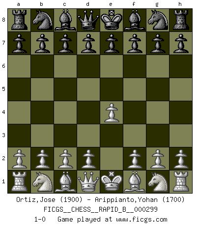 Last move : 1-0 2018 November 18 11:1:21 [Event "FICGS__CHESS__RAPID_B__000299"] [Site "FICGS"] [Date "2018.10.19"] [Round "1"] [White "Ortiz,Jose"] [Black "Arippianto,Yohan"] [Result "1-0"] [WhiteElo "1900"] [BlackElo "1700"] 1.e4 1-0 This chess game has been lost on time (started : 2018.10.19 2:17:51) King's pawn Opening Player White won this chess game. Follow this game move after move (download)Life is a kind of Chess, with struggle, competition, good and ill events. (Benjamin Franklin) Strategie ist, wie man ein Mädchen auf den Rücksitz bekommt. Taktik ist, was man tut, wenn man dann dort ist. (Anonymous) La señal de un Gran Maestro es su habilidad de ganar una partida rápidamente y sin dolor. (Irving Chernev) Les sacrifices démontrent seulement que quelqu'un a gaffé. (Savielly Tartacover) You can only get smarter by playing a smarter opponent. (Revolver, movie)