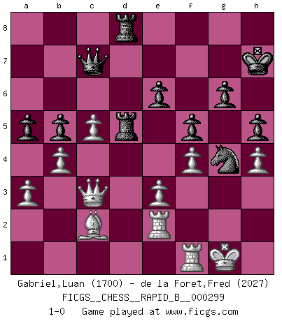 Last move : 1-0 2019 January 28 10:19:9 [Event "FICGS__CHESS__RAPID_B__000299"] [Site "FICGS"] [Date "2018.10.19"] [Round "1"] [White "Gabriel,Luan"] [Black "de la Foret,Fred"] [Result "1-0"] [WhiteElo "1700"] [BlackElo "2027"] 1.d4 Nf6 2.c4 e6 3.Nf3 d5 4.Nc3 Be7 5.Bg5 O-O 6.e3 Nbd7 7.Rc1 c6 8.Bd3 dxc4 9.Bxc4 b5 10.Bd3 Bb7 11.O-O h6 12.Bxf6 Bxf6 13.Bb1 c5 14.Qc2 g6 15.dxc5 Bxf3 16.gxf3 Bxc3 17.Qxc3 Qg5+ 18.Kh1 Qh5 19.Qd4 Qxf3+ 20.Kg1 Nf6 21.Qh4 Rad8 22.Qg3 Qc6 23.b4 Rd5 24.h4 Rfd8 25.f3 Nh5 26.Qe1 Nf6 27.Qg3 Nh5 28.Qe1 Qc7 29.f4 Nf6 30.Bc2 h5 31.Rf2 a5 32.a3 Ng4 33.Re2 f5 34.Qc3 Kh7 35.Rf1 1-0 Queen's pawn game Kingside Castling by player Black (move 5) Kingside Castling by player White (move 11) Player White won this chess game. Follow this game move after move (download)One of these modest little moves may be more embarrassing to your opponent than the biggest threat. (Siegbert Tarrasch) Ich würde die 30 stärksten Spieler der USA im Simultanspiel besiegen. (José Raúl Capablanca) Estaba muy claro de que el punto vulnerable del Gran Maestro Americano (Bobby Fischer) radicaba en las posiciones de doble filo, colgantes, irracionales, donde el siempre falló en encontrar un triunfo aún en una posición de clara victoria. (Efim Geller) Le joueur d'Echecs qui veut atteindre le top est obligé de développer son propre credo créatif. Alexeï Stepanovicth Souétine. Il est facile d'écrire des livres ! Ce qui est difficile, c'est de jouer ! (Alexeï Stepanovicth Souétine) Plans are ideas that never come to fruition. (Daniel Parmet)