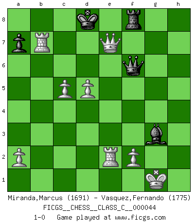 Last move : 1-0 2007 August 21 5:15:34 [Event "FICGS__CHESS__CLASS_C__000044"] [Site "FICGS"] [Date "2007.05.23"] [Round "1"] [White "Miranda,Marcus"] [Black "Vasquez,Fernando"] [Result "1-0"] [WhiteElo "1691"] [BlackElo "1775"] 1.e4 e5 2.Nf3 Nf6 3.Nxe5 d6 4.Nf3 Nxe4 5.d4 d5 6.Bd3 Bd6 7.O-O O-O 8.c4 c6 9.cxd5 cxd5 10.Nc3 Nxc3 11.bxc3 Nc6 12.Rb1 Re8 13.Ng5 g6 14.Qf3 Qc7 15.h4 Rd8 16.h5 h6 17.hxg6 hxg5 18.Bxg5 fxg6 19.Bxd8 Nxd8 20.Bxg6 Kg7 21.Qh5 Ne6 22.g3 Nf8 23.Bc2 Qf7 24.Qg5+ Ng6 25.Rfe1 Qf6 26.Qxd5 Ne7 27.Qh5 Be6 28.Rb5 Rg8 29.Bb3 Bf7 30.Bxf7 Rh8 31.Qg4+ Kxf7 32.Rxb7 Qh6 33.Qf5+ Qf6 34.Qe4 Rf8 35.c4 Ke8 36.Re2 Kd8 37.c5 Bc7 38.d5 Bxg3 39.Qxe7+ 1-0 Petrov : Classical attack, Marshall variation Kingside Castling by player White (move 7) Kingside Castling by player Black (move 7) Player White won this chess game. Follow this game move after move (download)Chess is a fighting game which is purely intellectual and includes chance. (Richard Reti) Das Spiel gibt uns die Genugtuung, die das Leben uns versagt. (Emanuel Lasker) El Ajedrez es un terrible juego. Si no controlas el centro, tu oponente tiene una posición mas holgada. Si tienes control del centro, ¡entonces realmente tu tienes algo de que preocuparte!. (Siegbert Tarrasch) Un footballeur joue avec ses pieds, parfois avec sa tête. Un joueur d'échecs ne joue qu'avec sa tête. Et quand il ne joue plus, il meurt. (Jacob Murray) I can't decide which is riskier; taking crazy risks, or taking advice on crazy risks from a crazy risk taker. (Gregory House in House M.D.)