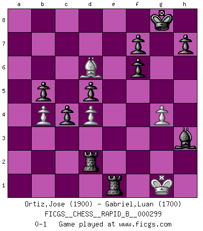 Last move : 0-1 2019 January 7 8:7:4 [Event "FICGS__CHESS__RAPID_B__000299"] [Site "FICGS"] [Date "2018.10.19"] [Round "1"] [White "Ortiz,Jose"] [Black "Gabriel,Luan"] [Result "0-1"] [WhiteElo "1900"] [BlackElo "1700"] 1.e4 c5 2.Bc4 e6 3.c3 d5 4.exd5 exd5 5.Qe2+ Be7 6.Bb5+ Nd7 7.Nf3 Ngf6 8.O-O O-O 9.d4 Bd6 10.Be3 c4 11.Re1 Re8 12.Nbd2 Qa5 13.Bxd7 Bxd7 14.b3 b5 15.Ng5 Bf5 16.Qf3 Bg4 17.b4 Qc7 18.Qxf6 Bxh2+ 19.Kh1 gxf6 20.Nh3 a5 21.Nf1 Bd6 22.Rab1 axb4 23.cxb4 Bxh3 24.g3 Qd7 25.Nh2 Qe6 26.Bf4 Qxe1+ 27.Rxe1 Rxe1+ 28.Nf1 Rxa2 29.Kh2 Bxf1 30.Bxd6 Rxf2+ 31.Kg1 Rd2 32.g4 Bh3 0-1 Sicilian defense Kingside Castling by player White (move 8) Kingside Castling by player Black (move 8) Player Black won this chess game. Follow this game move after move (download)The tactician must know what to do whenever something needs doing; the strategist must know what to do when nothing needs doing. (Savielly Tartakover) Gegen einen Schachcomputer zu verlieren ist wie Löcher in den Strümpfen zuhaben. Es ist nicht peinlich, solange man der einzige ist der es weiß. (Anonymous) Bobby solo arroja las piezas y solas caen en las casillas correctas. (Miguel Najdorf ) Mais n'est-ce pas déjà le limiter injurieusement que d'appeler les échecs un jeu? N'est-ce pas aussi une science, un art, ou quelque chose qui, comme le cercueil de Mahomet entre ciel et terre, est suspendu entre l'un et l'autre, et qui réunit un nombre incroyable de contraires ? (Stefan Zweig) The bottom line is always the bottom line. (Johann Piek)