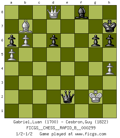 Last move : 1/2-1/2 2019 March 13 1:44:51 [Event "FICGS__CHESS__RAPID_B__000299"] [Site "FICGS"] [Date "2018.10.19"] [Round "1"] [White "Gabriel,Luan"] [Black "Cesbron,Guy"] [Result "1/2-1/2"] [WhiteElo "1700"] [BlackElo "1822"] 1.d4 Nf6 2.c4 d6 3.Nc3 Nbd7 4.e4 e5 5.Nge2 Be7 6.f3 O-O 7.Be3 c6 8.d5 cxd5 9.cxd5 Nh5 10.Qd2 Nb6 11.b3 Bd7 12.g3 g6 13.Bh6 Re8 14.a4 Bc8 15.a5 Nd7 16.b4 Ndf6 17.Be3 Bd7 18.Bg2 Qc7 19.O-O Rec8 20.Rfc1 Qd8 21.b5 Ng7 22.b6 a6 23.Rc2 Nfe8 24.Rf1 f5 25.f4 Rc4 26.Nd1 Rxc2 27.Qxc2 Rc8 28.Qd2 fxe4 29.Nf2 Nf5 30.Nxe4 exf4 31.Bxf4 Nf6 32.Ng5 Rc4 33.Ne6 Qc8 34.Rc1 Rxc1+ 35.Qxc1 Bxe6 36.dxe6 Qxe6 37.Bf3 Ne4 38.Qc7 Nc5 39.Kh1 Bf8 40.Qd8 h6 41.h4 Nd3 42.g4 Nxf4 43.gxf5 Qxf5 44.Nxf4 Qxf4 45.Bd5+ Kh7 46.Bxb7 Qf1+ 47.Kh2 Qf4+ 48.Kh3 Qf5+ 49.Kg2 Qg4+ 50.Kf2 Qd4+ 51.Kf3 Qd3+ 52.Kg2 Qe2+ 53.Kg3 Qe5+ 54.Kg2 Qe2+ 55.Kg3 Qe5+ 56.Kg2 Qe2+ 1/2-1/2 Old Indian defense Kingside Castling by player Black (move 6) Kingside Castling by player White (move 19) This chess game ended in a draw. Follow this game move after move (download)Not only will I predict his triumph over Botvinnik, but I'll go further and say that he'll probably be the greatest Chess player that ever lived. (John Collins) Der beste Spieler in einem Turnier gewinnt es nie. Er landet auf Platz zwei oder drei. (Siegbert Tarrasch) Buenas posiciones no logran ganar juegos, buenas movidas sí. (Gerald Abrahams) Vous m'avez demandé de vous exposer quel est le fondement de la prière. Je ne fais que préparer les pièces du jeu sur la table... Nous sera-t-il permis d'en adopter les règles et si nous les appliquons scrupuleusement nous ne tarderons pas à faire mat le Roi divin ! Il ne pourra échapper à nos mains. (Sainte Thérèse d'Avila, Chemin de perfection) The best teachers teach from the heart, not from the book. (Author unknown)