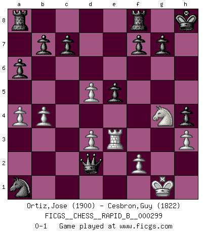 Last move : 0-1 2019 January 14 2:58:50 [Event "FICGS__CHESS__RAPID_B__000299"] [Site "FICGS"] [Date "2018.10.19"] [Round "1"] [White "Ortiz,Jose"] [Black "Cesbron,Guy"] [Result "0-1"] [WhiteElo "1900"] [BlackElo "1822"] 1.e4 e5 2.Nf3 Nc6 3.Bc4 Bc5 4.c3 Nf6 5.d3 d6 6.O-O O-O 7.b4 Bb6 8.Re1 h6 9.h3 Nh5 10.Be3 Qf6 11.Nbd2 Bd7 12.a4 Bxe3 13.Rxe3 Nf4 14.Nf1 h5 15.N3h2 a6 16.Ng3 h4 17.Nf5 Bxf5 18.exf5 Qxf5 19.Rf3 Qg5 20.Ng4 d5 21.Bb3 Kh8 22.Qd2 Nxh3+ 23.gxh3 Qxd2 24.c4 Nd4 25.Re3 Nxb3 26.cxd5 Nxa1 0-1 Giuoco Piano Kingside Castling by player White (move 6) Kingside Castling by player Black (move 6) Player Black won this chess game. Follow this game move after move (download)War is the child of passion, passion is the child of narcissism and narcissism is the child. (...) Another game ? (Thibault de Vassal) Ich moechte nie einem Club beitreten, der Leute wie mich als Mitglieder aufnimmt. (Woody Allen) Cuando veas una buena jugada, trata de encontrar otra mejor. (Emanuel Lasker) Pour se monter efficace, un Cavalier a besoin d'avant-postes ! Les Cavaliers font les meilleurs bloqueurs de pions passés. The next best thing to gambling and winning is gambling and loosing. (Nick Dandalos)