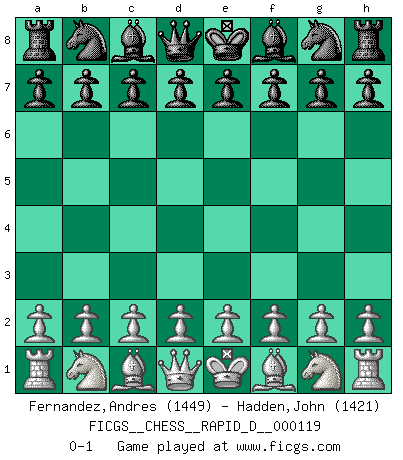 Last move : 0-1 2018 November 19 11:3:13 [Event "FICGS__CHESS__RAPID_D__000119"] [Site "FICGS"] [Date "2018.10.20"] [Round "1"] [White "Fernandez,Andres"] [Black "Hadden,John"] [Result "0-1"] [WhiteElo "1449"] [BlackElo "1421"] 0-1 This chess game has been lost on time (started : 2018.10.20 2:35:35) Player Black won this chess game. Follow this game move after move (download)I'm not afraid of Spassky. The world knows I'm the best. You don't need a match to prove it. (Bobby Fischer) Fischer: 'Remis!?' Uhlmann: 'Aber es muss doch dreimal Zugwiederholung sein!' Fischer: 'Sie nehmen das Remis an, wie ich es sage, sonst spiele ich weiter und werde Sie dann schlagen!' (Robert James Fischer) El Ajedrez es despiadado: debes de estar preparado para matar gente. (Nigel Short) Assurément je connaissais par expérience le mystérieux attrait de ce jeu royal, le seul entre tous les jeux inventés par les hommes qui échappe souverainement à la tyrannie du hasard, le seul où l'on ne doive sa victoire qu'à son intelligence ou plutôt à une certaine forme d'intelligence. Mais n'est-ce pas déjà le limiter injurieusement que d'appeler les échecs un jeu ? N'est-ce pas une science, un art ou quelque chose qui, comme le cercueil de Mahomet entre ciel et terre, est suspendu entre l'un et l'autre, et qui réunit un nombre incroyable de contraires ? [...] C'est une pensée qui ne mène à rien, une mathématique qui n'établit rien, un art qui ne laisse pas d'uvre, une architecture sans matière; et il l'a prouvé néanmoins qu'il était plus durable, à sa manière, que les livres ou que tout autre monument, ce jeu unique qui appartient à tous les peuples et à tous les temps, et dont personne ne sait quel dieu en fit don à la terre pour tuer l'ennui, pour aiguiser l'esprit et stimuler l'âme. Où commence-t-il, où finit-il ? (Stefan Zweig) Looking at the proliferation of personal web pages on the Net, it looks like very soon everyone on Earth will have 15 megabytes of fame. (M.G. Sriram)