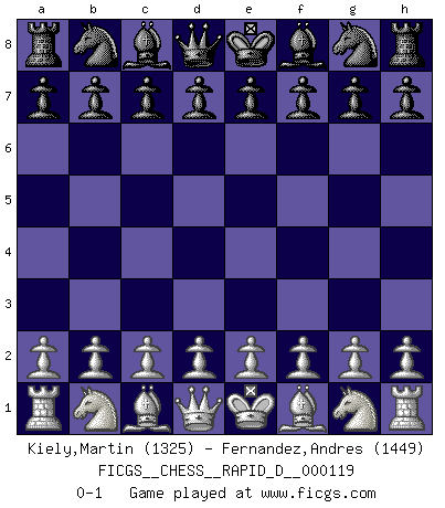 Last move : 0-1 2018 November 19 11:3:13 [Event "FICGS__CHESS__RAPID_D__000119"] [Site "FICGS"] [Date "2018.10.20"] [Round "1"] [White "Kiely,Martin"] [Black "Fernandez,Andres"] [Result "0-1"] [WhiteElo "1325"] [BlackElo "1449"] 0-1 This chess game has been lost on time (started : 2018.10.20 2:35:35) Player Black won this chess game. Follow this game move after move (download)Alekhine is a poet who creates a work of art out of something that would hardly inspire another man to send home a picture post card. (Max Euwe) Es ist peinlich, dass ich nie Weltmeister wurde. Es wäre leicht, Leonid Breschnjew als Ursache vorzuschieben, dessen Apparat den Vorzeigekommunisten Anatoli Karpow in allem unterstützte. Aber Garri Kasparow zum Beispiel, der ebenfalls von den Sowjets unerwünscht war, hat trotz der Widerstände den WM-Titel erobert. (Viktor Kortschnoi) Yo no le temo a Spassky. Todos saben que yo soy el mejor. Uno no necesita un torneo para probarlo. (Bobby Fischer) Le profane ne songe pas à la somme de jouissance dont il se prive, qui méconnaît ce jeu aux ressources aussi variées que passionnantes. (Jean-Marie Jeanton-Lamarche) Never risk one's whole fortune unless supported by one's entire army. (Niccolo Machiavelli)