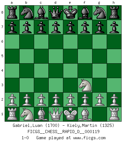 Last move : 1-0 2018 November 19 11:3:13 [Event "FICGS__CHESS__RAPID_D__000119"] [Site "FICGS"] [Date "2018.10.20"] [Round "1"] [White "Gabriel,Luan"] [Black "Kiely,Martin"] [Result "1-0"] [WhiteElo "1700"] [BlackElo "1325"] 1.Nf3 1-0 This chess game has been lost on time (started : 2018.10.20 2:35:35) Reti Opening Player White won this chess game. Follow this game move after move (download)Chess is in its essence a game, in its form an art, and in its execution a science. (Baron Tassilo) Fallen sollten polizeilich verboten werden. (Savielly Grigorievitsch Tartakower) El Ajedrez expande y enriquece tu mente. (Saudin Robovic) Avec des compensations pour le matériel en plus... (Anonyme) All battles are fought by scared men who'd rather be someplace else. (John Wayne in the movie In harm's way)