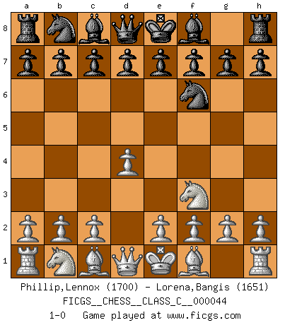 Last move : 1-0 2007 July 2 15:34:36 [Event "FICGS__CHESS__CLASS_C__000044"] [Site "FICGS"] [Date "2007.05.23"] [Round "1"] [White "Phillip,Lennox"] [Black "Lorena,Bangis"] [Result "1-0"] [WhiteElo "1700"] [BlackElo "1651"] 1.d4 Nf6 2.Nf3 1-0 This chess game has been lost on time (started : 2007.05.23 5:41:21) Queen's pawn game Player White won this chess game. Follow this game move after move (download)If you aren't afraid of Spassky, then I have removed the element of money. (Jim Slater) Wenn ich gewinne bin ich ein Genie. Wenn nicht, dann bin ich keines. (Robert James Fischer) El Ajedrez es tan interesante por sí solo, que no es necesario un interés monetario para persuadir a una persona a que lo practique; por lo tanto, nunca se juega por dinero. (Benjamin Franklin) Les échecs sont plus proches de l'art de l'assassinat que de l'art de la guerre. (Arturo Perez-Reverte) The meaning of life is that it is to be lived, and it is not to be traded and conceptualized and squeezed into a pattern of systems. (Bruce Lee)