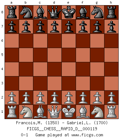 Last move : 0-1 2018 November 19 11:3:13 [Event "FICGS__CHESS__RAPID_D__000119"] [Site "FICGS"] [Date "2018.10.20"] [Round "1"] [White "Francois,Marc Raymond G."] [Black "Gabriel,Luan"] [Result "0-1"] [WhiteElo "1350"] [BlackElo "1700"] 0-1 This chess game has been lost on time (started : 2018.10.20 2:35:35) Player Black won this chess game. Follow this game move after move (download)We must make sure that Chess will not be like a dead language, very interesting, but for a very small group. (Sytze Faber) Frage: Was machen Sie mit den Preisen? Anwort: Ich habe Angst, dass meine Freundin davon neue Kleider kauft. (Loek van Wely) Puntos débiles o agujeros en la posición de tu oponente deben de ser ocupados por piezas, no Peones. (Siegbert Tarrasch) Mais n'est-ce pas déjà le limiter injurieusement que d'appeler les échecs un jeu? N'est-ce pas aussi une science, un art, ou quelque chose qui, comme le cercueil de Mahomet entre ciel et terre, est suspendu entre l'un et l'autre, et qui réunit un nombre incroyable de contraires ? (Stefan Zweig) They misunderestimated me. (George W. Bush, Bentonville nov. 6, 2000)