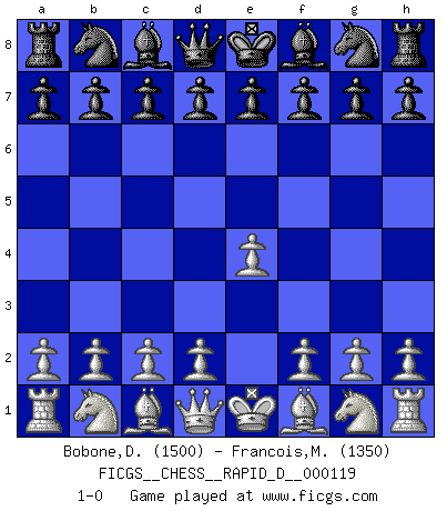 Last move : 1-0 2018 November 19 23:2:47 [Event "FICGS__CHESS__RAPID_D__000119"] [Site "FICGS"] [Date "2018.10.20"] [Round "1"] [White "Bobone,Diogo"] [Black "Francois,Marc Raymond G."] [Result "1-0"] [WhiteElo "1500"] [BlackElo "1350"] 1.e4 1-0 This chess game has been lost on time (started : 2018.10.20 2:35:35) King's pawn Opening Player White won this chess game. Follow this game move after move (download)You can only get good at Chess if you love the game. (Bobby Fischer) Computer sind die einzigen Gegner, die nicht immer eine Ausrede auf Lager haben, wenn sie gegen mich verlieren. (Robert James Fischer) Creo que una cierta cantidad de temperamento es esperada de los genios del Ajedrez. (Ron Gross) Que feriez-vous si vous étiez en train de jouer aux échecs et que la fin du monde arrive ? Je continuerais à jouer. (Saint Borromée) To steal ideas from one person is plagiarism. To steal from many is research. (Unknown)