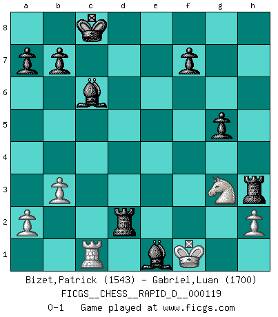 Last move : 0-1 2018 November 21 2:16:7 [Event "FICGS__CHESS__RAPID_D__000119"] [Site "FICGS"] [Date "2018.10.20"] [Round "1"] [White "Bizet,Patrick"] [Black "Gabriel,Luan"] [Result "0-1"] [WhiteElo "1543"] [BlackElo "1700"] 1.e4 e6 2.d4 d5 3.e5 c5 4.c3 Nc6 5.Bd3 cxd4 6.cxd4 Nxd4 7.Bxh7 Nc6 8.Bxg8 Nxe5 9.Nc3 Rxg8 10.Qh5 Ng6 11.Nge2 Rh8 12.Qf3 Nh4 13.Qg3 Nf5 14.Qd3 Bd7 15.Nxd5 exd5 16.Qxd5 Qf6 17.O-O Bc6 18.Qb3 Qh4 19.Qh3 Qxh3 20.gxh3 O-O-O 21.Bf4 g5 22.Bg3 Rd2 23.Rfe1 Rxh3 24.b3 Bc5 25.Rac1 Nxg3 26.Nxg3 Bxf2+ 27.Kf1 Bxe1 0-1 French : Advance variation Kingside Castling by player White (move 17) Queenside Castling by player Black (move 20) Player Black won this chess game. Follow this game move after move (download)A good sacrifice is one that is not necessarily sound but leaves your opponent dazed and confused. (Rudolph Spielmann) Frage des Reporters: -Worin besteht das Ziel von Gambiteröffnungen? Antwort: -Auf Kosten der Partie einen Ruf als Angriffspieler zu erwerben.- (Siegbert Tarrasch) Prefiero perder una partida realmente buena, que ganar una mala. (David Levy) Karpov est une pièce de musée. (Garry Kasparov) You can't play chess if you're groggy from pills. (Anatoly Karpov)