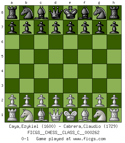 Last move : 0-1 2018 November 29 23:55:25 [Event "FICGS__CHESS__CLASS_C__000262"] [Site "FICGS"] [Date "2018.10.20"] [Round "1"] [White "Caya,Ezykiel"] [Black "Cabrera,Claudio"] [Result "0-1"] [WhiteElo "1600"] [BlackElo "1729"] 0-1 This chess game has been lost on time (started : 2018.10.20 16:13:52) Player Black won this chess game. Follow this game move after move (download)The older I grow, the more I value pawns. (Paul Keres) Wenn ich mich einlogge, glauben die Leute gewöhnlich nicht, dass ich es selbst bin und sie fangen an, mir dumme Fragen zu stellen. Und wenn sie es glauben, stellen sie wieder andere dumme Fragen. (Judith Polgar) En el tablero, la mentira e hipocresía no sobreviven mucho. (Emanuel Lasker) Karpov est une pièce de musée. (Garry Kasparov) There is a great deal of difference between an eager man who wants to read a book and a tired man who wants a book to read. (G.K. Chesterton)