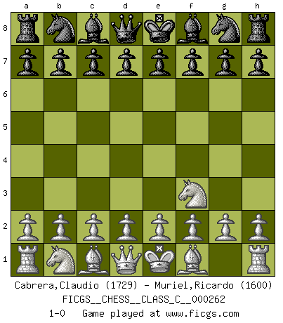 Last move : 1-0 2018 November 29 23:55:25 [Event "FICGS__CHESS__CLASS_C__000262"] [Site "FICGS"] [Date "2018.10.20"] [Round "1"] [White "Cabrera,Claudio"] [Black "Muriel,Ricardo"] [Result "1-0"] [WhiteElo "1729"] [BlackElo "1600"] 1.Nf3 1-0 This chess game has been lost on time (started : 2018.10.20 16:13:52) Reti Opening Player White won this chess game. Follow this game move after move (download)For surely of all the drugs in the world, Chess must be the most permanently pleasurable. (Assiac) Die westlichen Werte sind eine Sprache, welche die Putin-Administration nicht versteht. (Garry Kasparov) a manera como él juega al Ajedrez, demuestra la completa naturaleza de un hombre. (Stanley Ellin) Les erreurs sont comme les malheurs, elles n'arrivent jamais seules. (Siegbert Tarrasch) I don't diet. I just don't eat as much as I'd like to. (Linda Evangelista, supermodel)