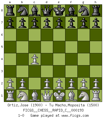 Last move : 1-0 2018 November 21 11:18:33 [Event "FICGS__CHESS__RAPID_C__000193"] [Site "FICGS"] [Date "2018.10.22"] [Round "1"] [White "Ortiz,Jose"] [Black "Tu Macho,Moposita"] [Result "1-0"] [WhiteElo "1900"] [BlackElo "1500"] 1.c4 1-0 This chess game has been lost on time (started : 2018.10.22 0:41:15) English Opening Player White won this chess game. Follow this game move after move (download)Fischer, who may or may not be mad as a hatter, has every right to be horrified. (Jeremy Silman) Ich war schon mal beim Dopingtest. Da musste ich Urin abgeben, während Dritte zusahen. (Elisabeth Pähtz) Un Peón pasado es un criminal, quién debe ser mantenido bajo candado y llave. Leves medidas, tales como vigilancia policiaca, no son suficientes. (Aaron Nimzovich) Nous sommes les pions de la mystérieuse partie d'Echecs jouée par Dieu. Il nous déplace, nous arrête, nous pousse encore, puis nous lance un à un dans la boîte du Néant. Epitaphe sur la tombe de David Janowsky (1868-1927). Computers are like Old Testament gods; lots of rules and no mercy. (Joseph Campbell)